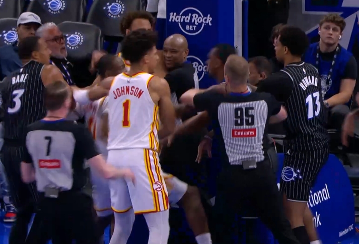 比塔泽身后拉拽兰代尔致其膝盖着地 2级恶意驱逐!丹尼尔斯吃T! 【发布时间】:2026-04-03 08:30 【来源】:24直播网 NBA常规赛,老鹰VS魔术。比赛末节,比塔泽在防守中从身后一把拉下空中的兰代尔,致其膝盖着。随后老鹰众将不满,双方爆发激烈冲突。裁判在冲突中紧紧抱着情绪激动的老鹰后卫丹尼尔斯,随后两人双双倒地。最终,比塔泽二级恶意犯规离场,丹尼尔斯技术犯规,兰代尔退赛。裁判为保护丹尼尔斯 两人双双倒地