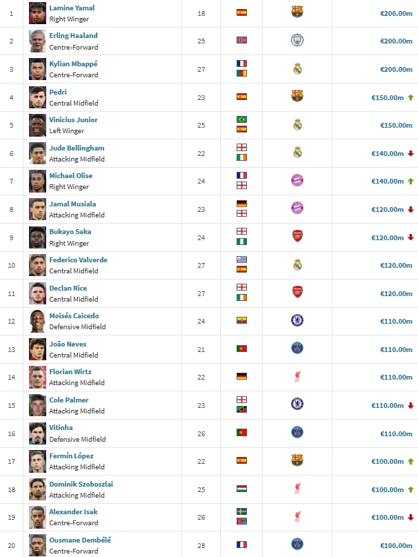 1-亚马尔、哈兰德、姆巴佩,2亿